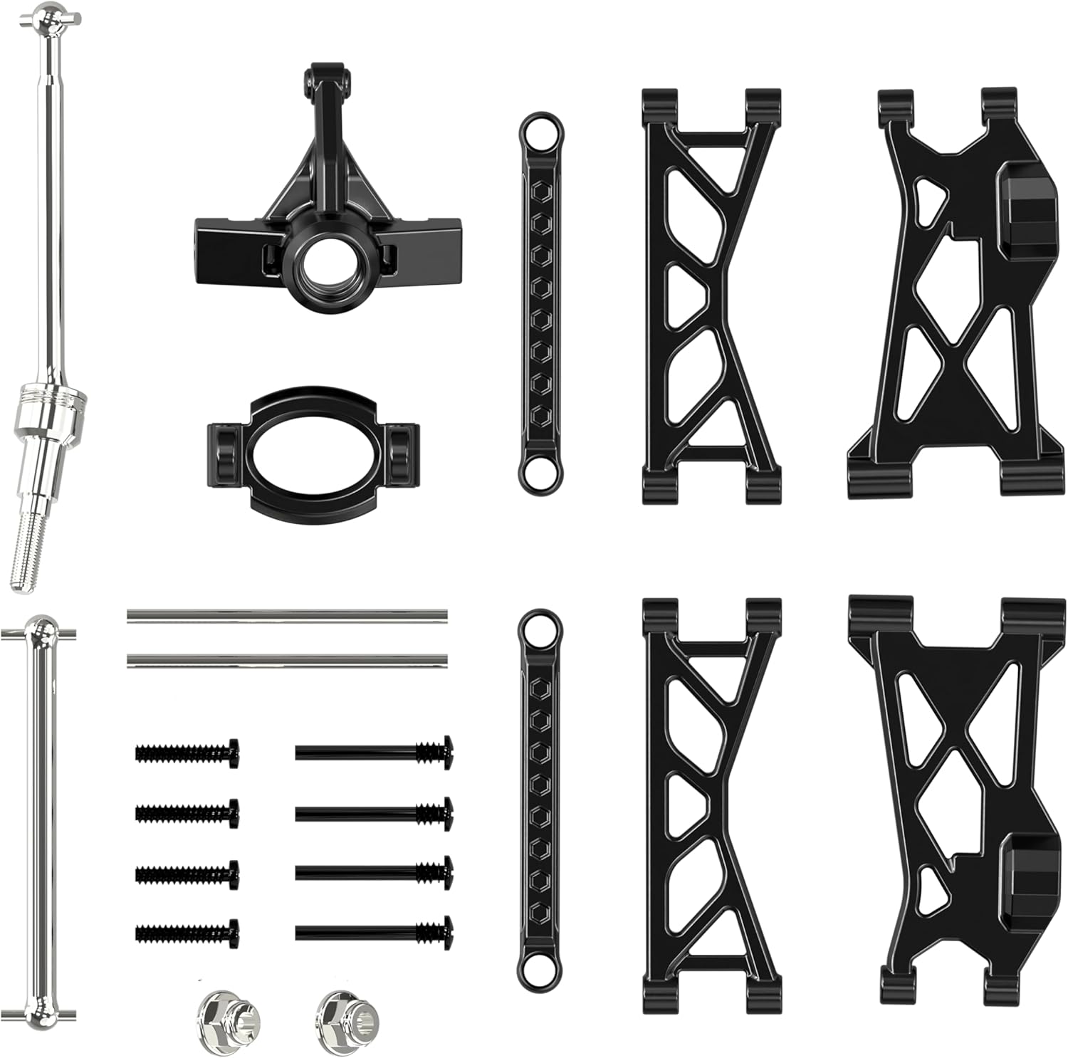 - Accessories List:Metal Front CVD*1,Metal Rear wheelDrive Shaftts*1,Left And Right Suspension Arms*1,L/R Steering Links*1,L/R Front Hub CarriersAnd Steering Hubs*1,Front Rear Upper Links(2PCS),Suspension Pins2.5X47mm *2