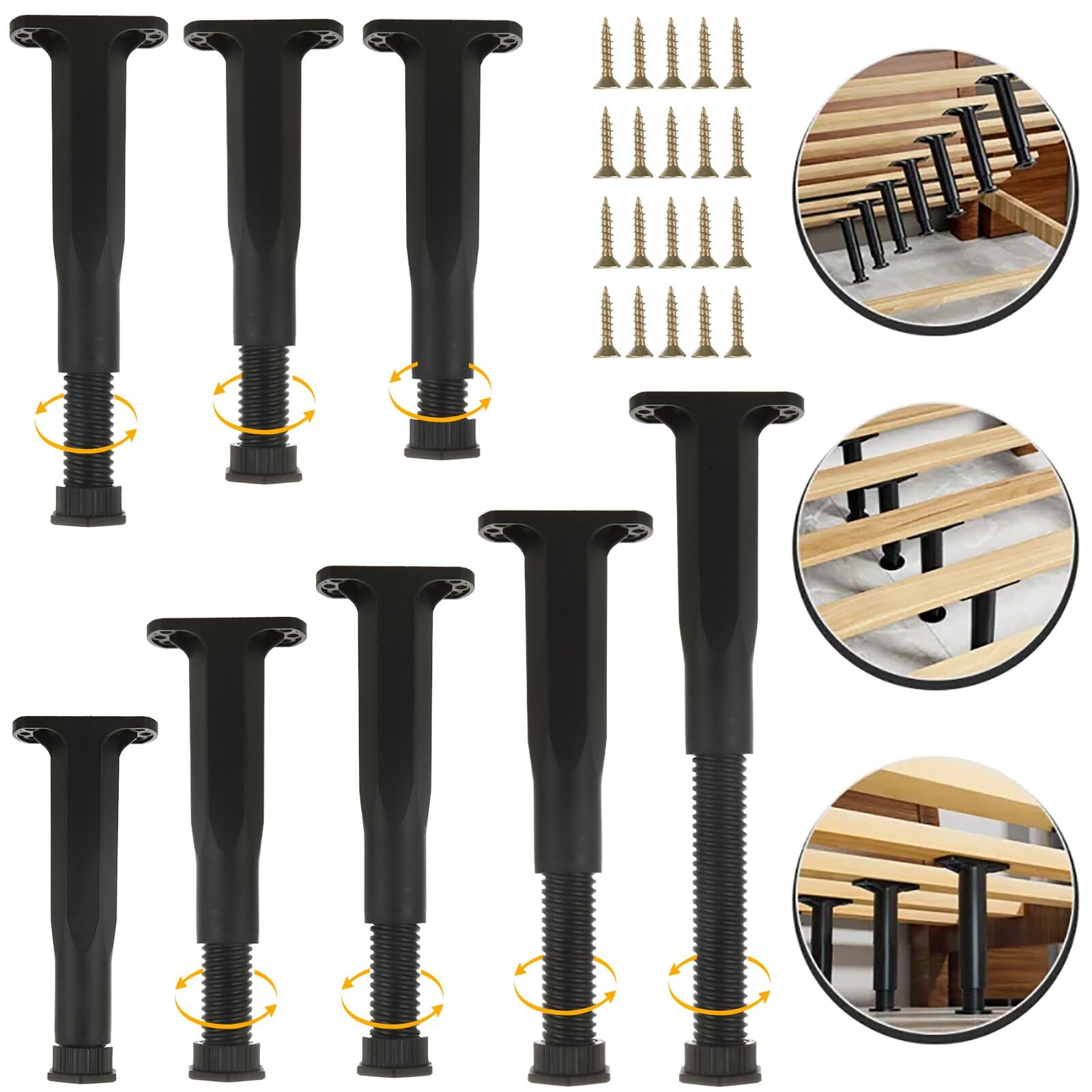 - 【Package Include】The adjustable bed support legs include: 8 pcs furniture legs, 48 pcs screws. Sufficient quantity for daily use or replacement. The bed frame legs can be used in a humid environment with confidence and adds the necessary support to your bed slats or bed frame, effectively protecting your bed base/ slatted bed frames/ platform bed frame from sagging and damage. Save you money on bed repair and replacement